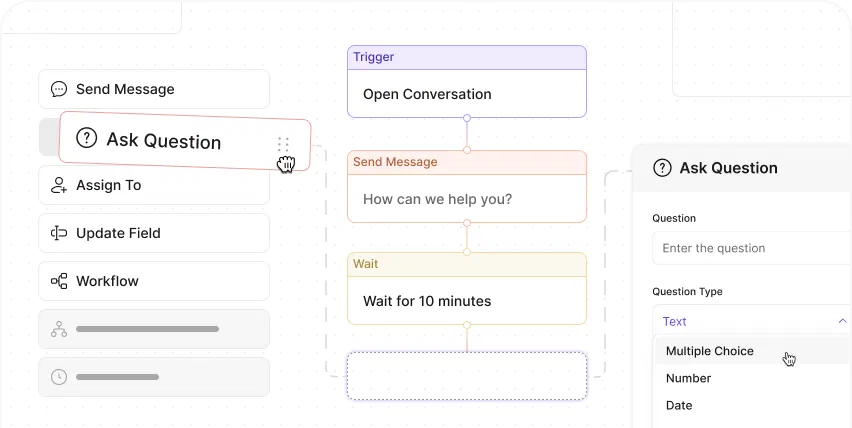 Streamline your processes by creating conversational & business workflows that automatically assign conversations to the right team, add tags, send automatic replies, or trigger custom actions.